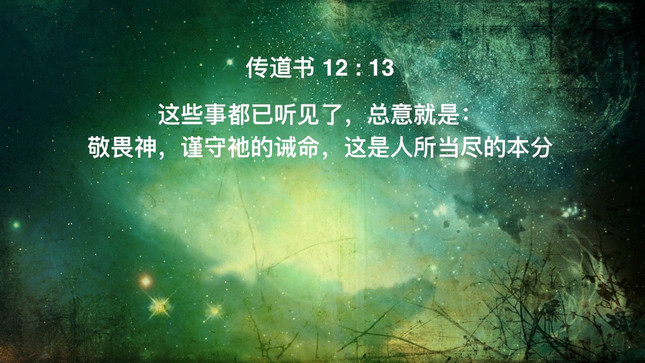 这些事都已听见了,总意就是:敬畏神,谨守祂的诫命,这是人所当尽的本分。【传道书 12:13】