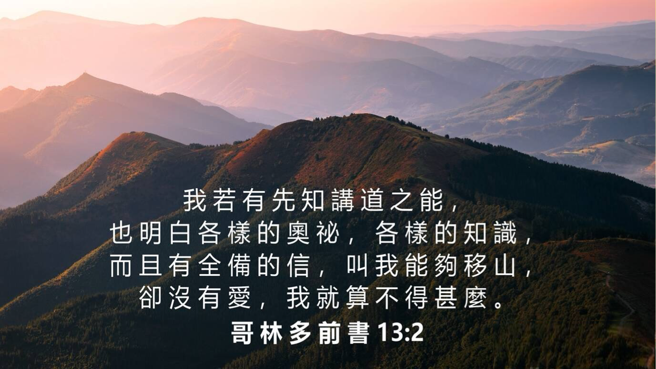我若有先知讲道之能,也明白各样的奥秘,各样的知识,而且有全备的信,叫我能够移山,却没有爱,我就算不得什么。【哥林多前书13:2】