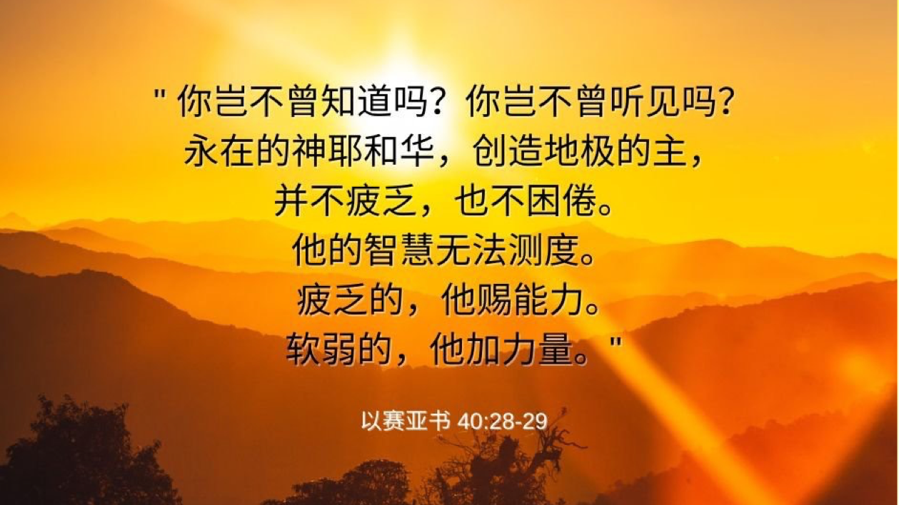 你岂不曾知道吗?你岂不曾听见吗?永在的神耶和华,创造地极的主,并不疲乏,也不困倦;祂的智慧无法测度。疲乏的,祂赐能力;软弱的,祂加力量。【以赛亚书 40:28-29】