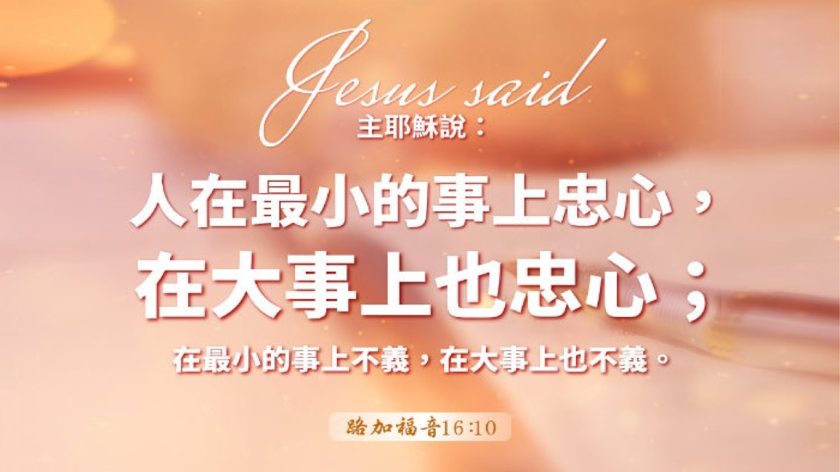 人在最小的事上忠心,在大事上也忠心;在最小的事上不义,在大事上也不义。【路加福音16:10】