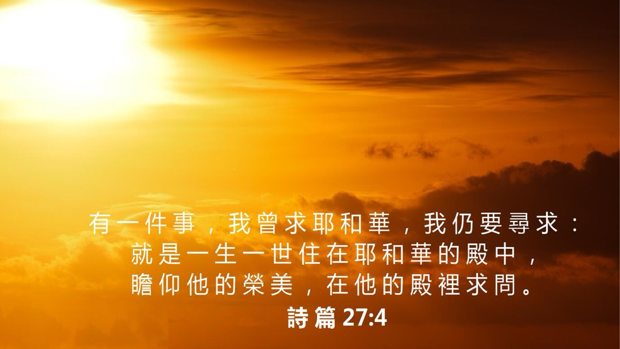 有一件事,我曾求耶和华,我仍要寻求:就是一生一世住在耶和华的殿中,瞻仰祂的荣美,在祂的殿里求问。【诗篇27:4】